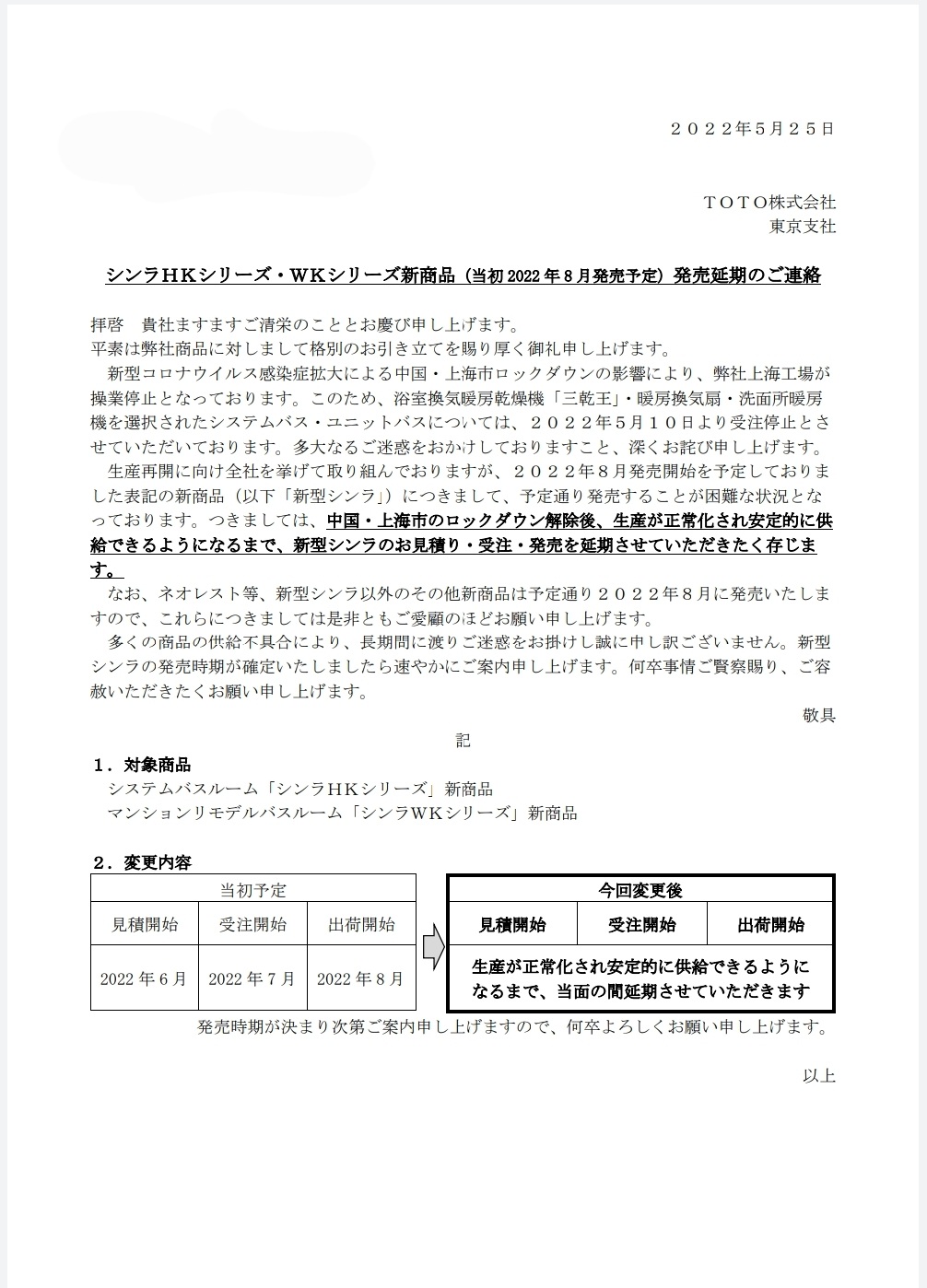 WL、WL一体形、三乾王におきましてご迷惑をお掛けしております。上海の一部地域ではロックダウンが解除されていると報道が出ておりますが、現状弊社上海工場は、まだ操業停止となっております。生産再開に向けて全社を挙げて取り組んでおりますが、2022年8月発売開始を予定しておりました表記の新商品「新シンラ」につきまして、予定通りに発売することが困難な状況となっております。(ご案内文、添付)つきましては、中国・上海市のロックダウン解除後、生産が正常化され安定的に供給出来るようになるまで、「新シンラ」のお見積り、受注、発売を延期させていただきます。